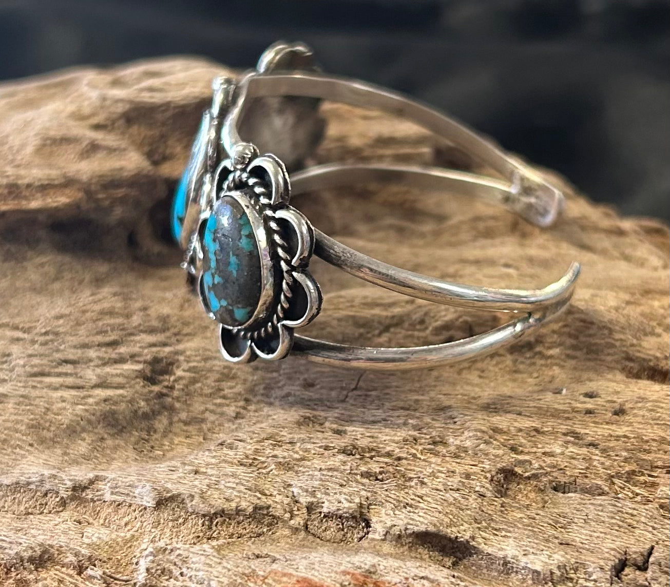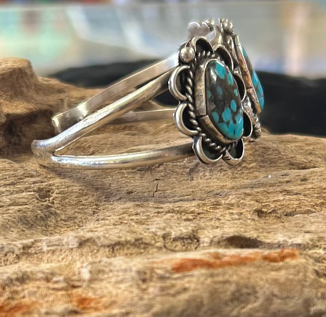 This vintage sterling silver bracelet showcases authentic turquoise mountain stones, handcrafted by Native American artisans during the 1970s or 80s. Each piece reflects the skilled craftsmanship and cultural heritage of that era, featuring high-quality turquoise set in genuine sterling silver. The natural variations in the stone create a one-of-a-kind aesthetic that speaks to its authenticity and age. A timeless accessory!