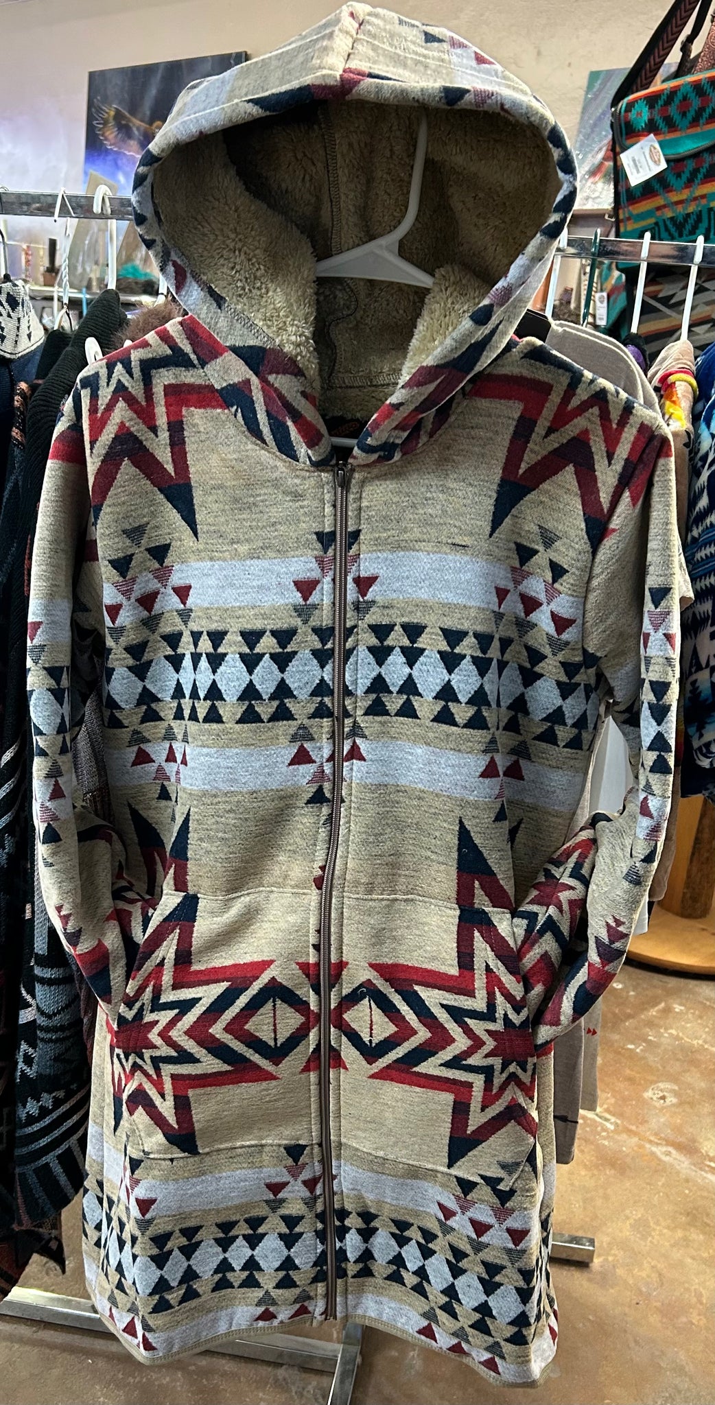 Wrap yourself in warmth and heritage with this Native Print Hooded Jacket. Featuring authentic indigenous-inspired patterns, this cozy layer combines comfort with cultural appreciation. The attached hood provides extra protection from the elements, while the relaxed fit makes it perfect for casual outings or layering. Soft, durable fabric keeps you comfortable all season long. Whether you're heading out for a quick errand or settling in for the evening, this jacket delivers the warmth and style you're looking for.