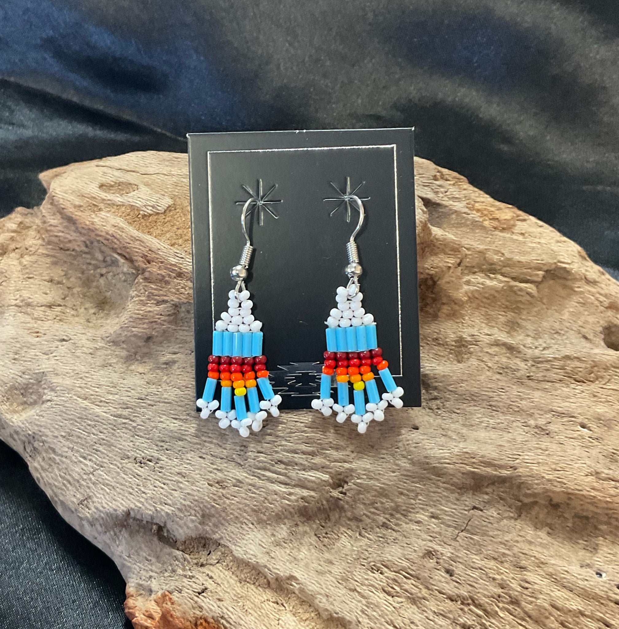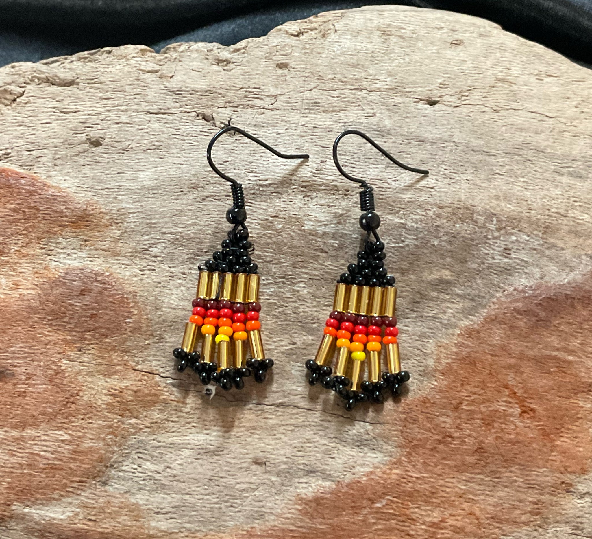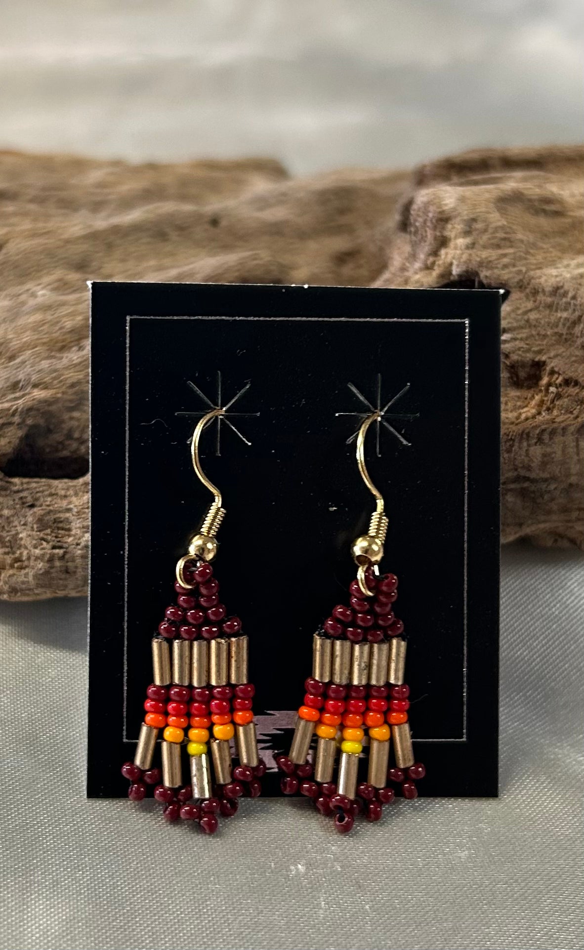 Add some fiery fun to your look with these small hand beaded dangle earrings! Made by Native American artisan Donna Budds, these earrings feature a beautiful array of fire colors that will catch everyone's eye. Perfect for adding a pop of color and quirky style to any outfit.
