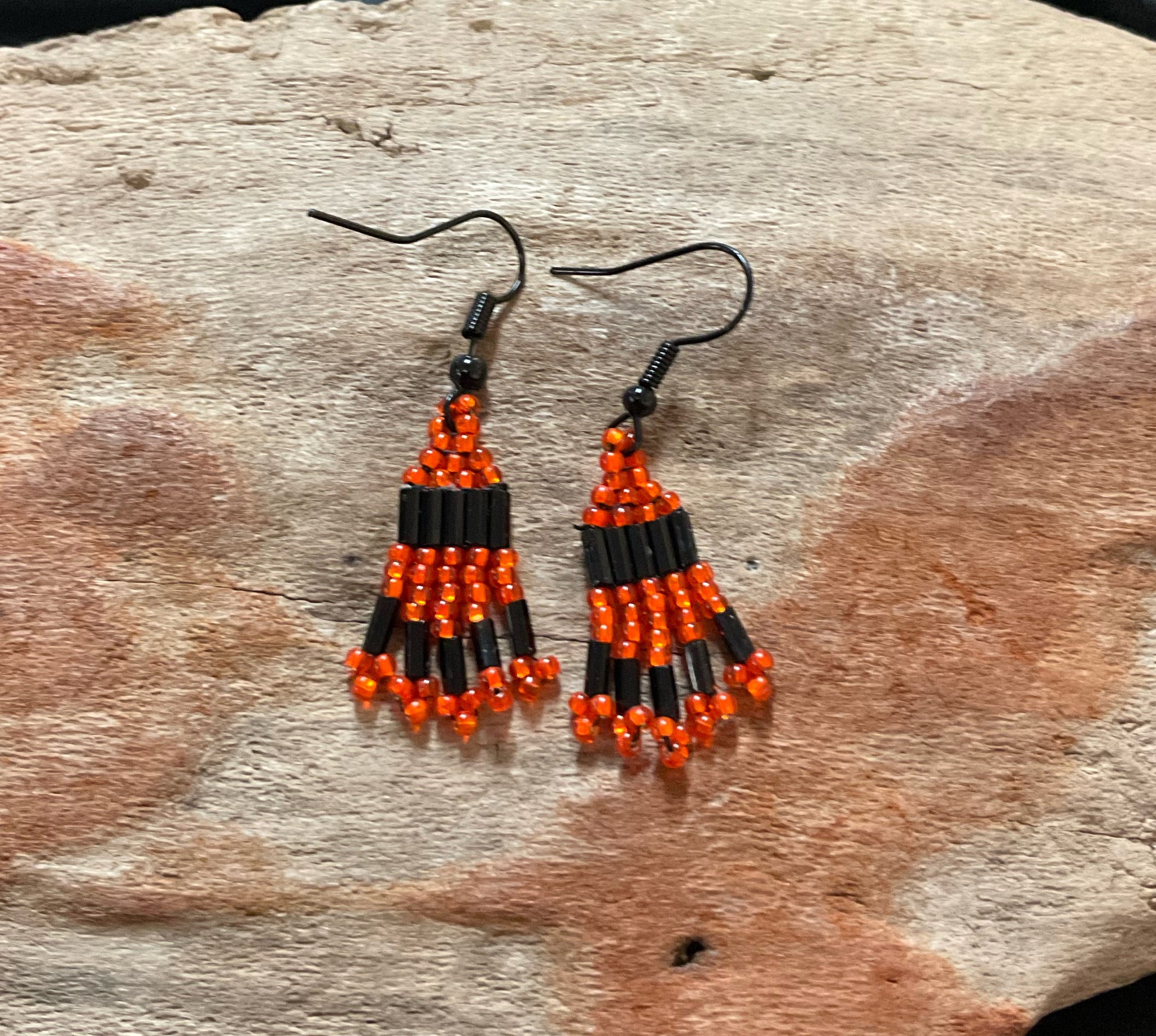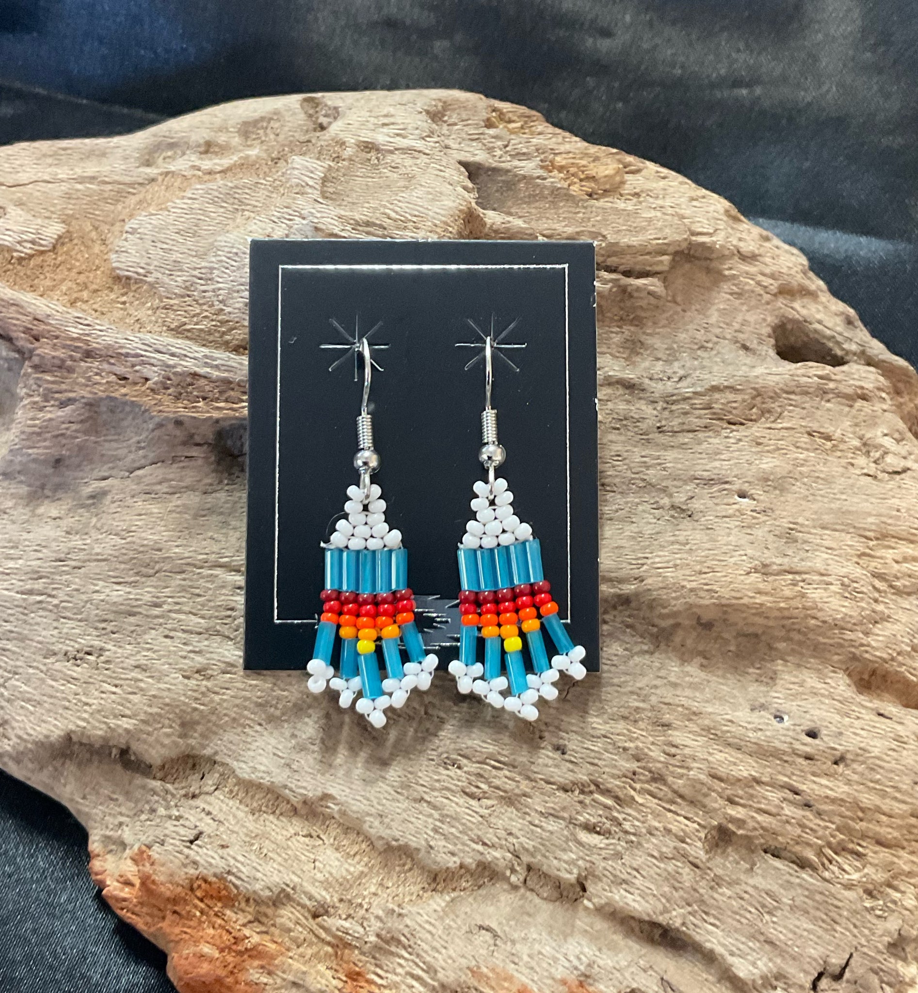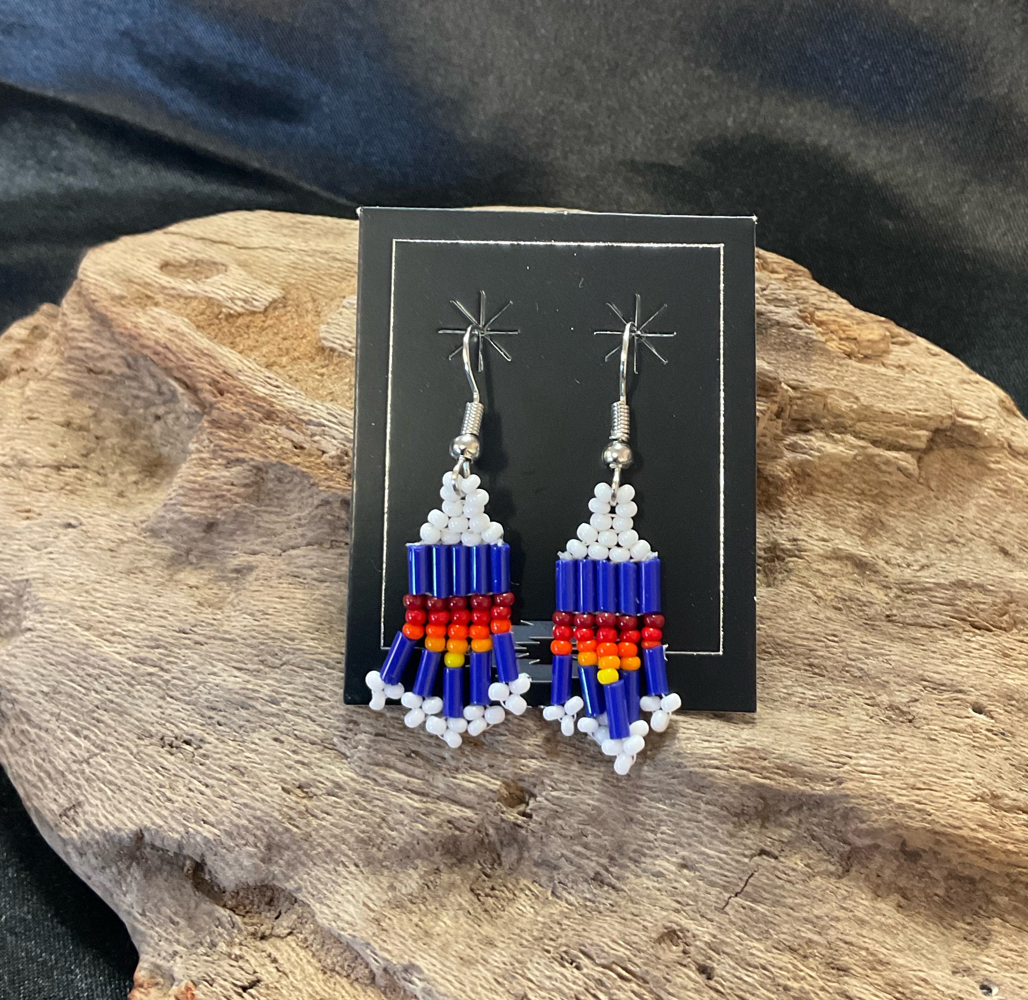 Add some fiery fun to your look with these small hand beaded dangle earrings! Made by Native American artisan Donna Budds, these earrings feature a beautiful array of fire colors that will catch everyone's eye. Perfect for adding a pop of color and quirky style to any outfit.
