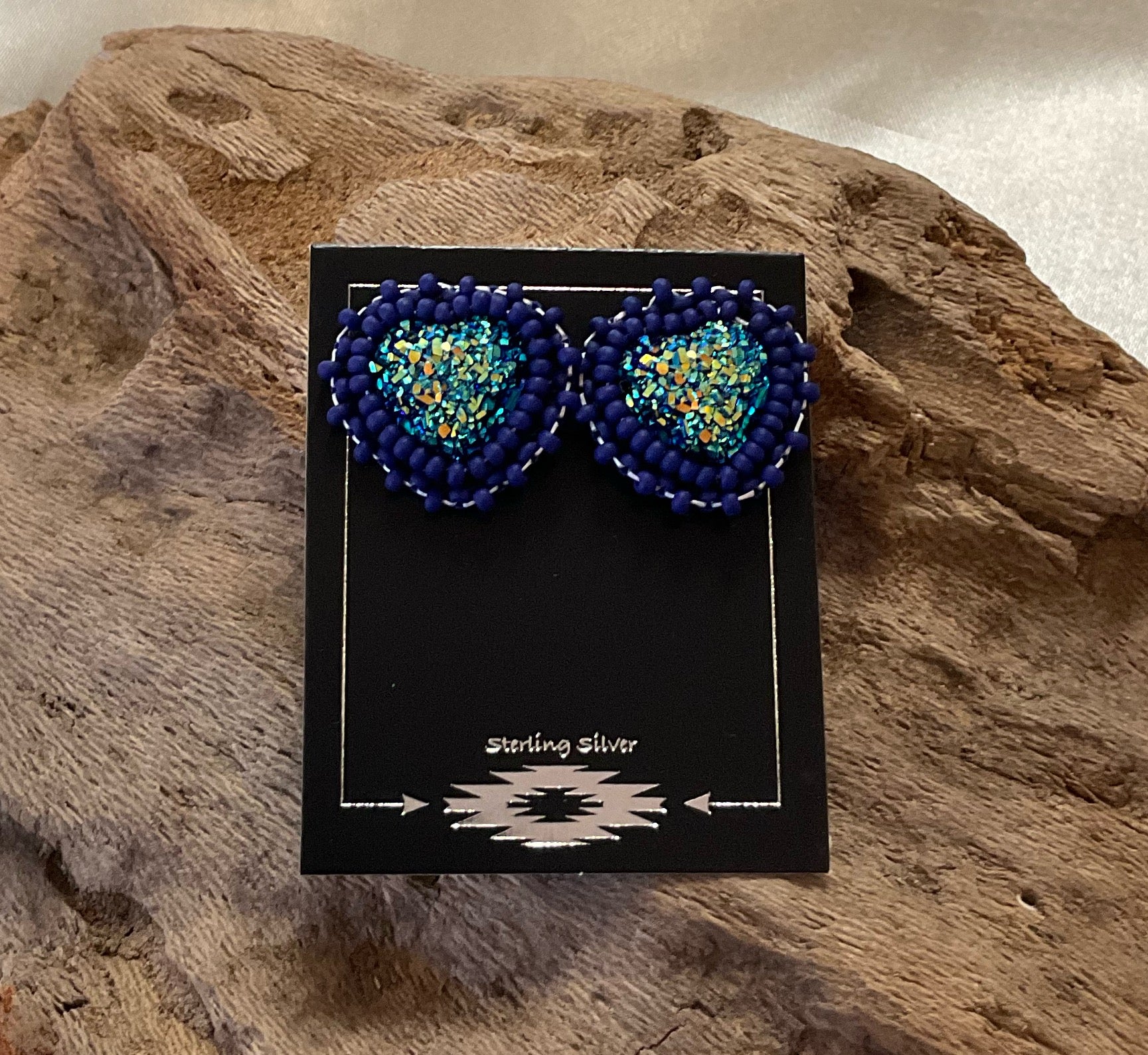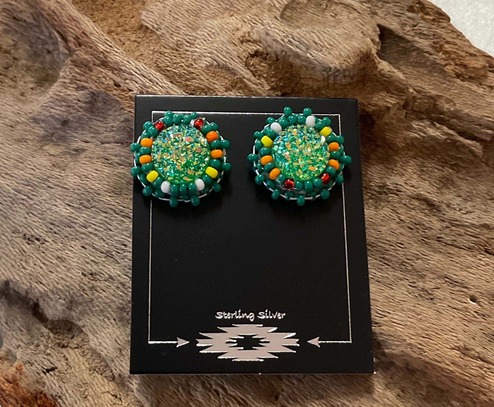 Add a splash of vibrant energy to your look with these Small Bling Studs/Dangle Earrings. Featuring an assortment of bright shapes and colors inspired by powwow style, they bring playful sparkle and bold personality to any outfit. Perfect for those who love to mix fun with flair.
