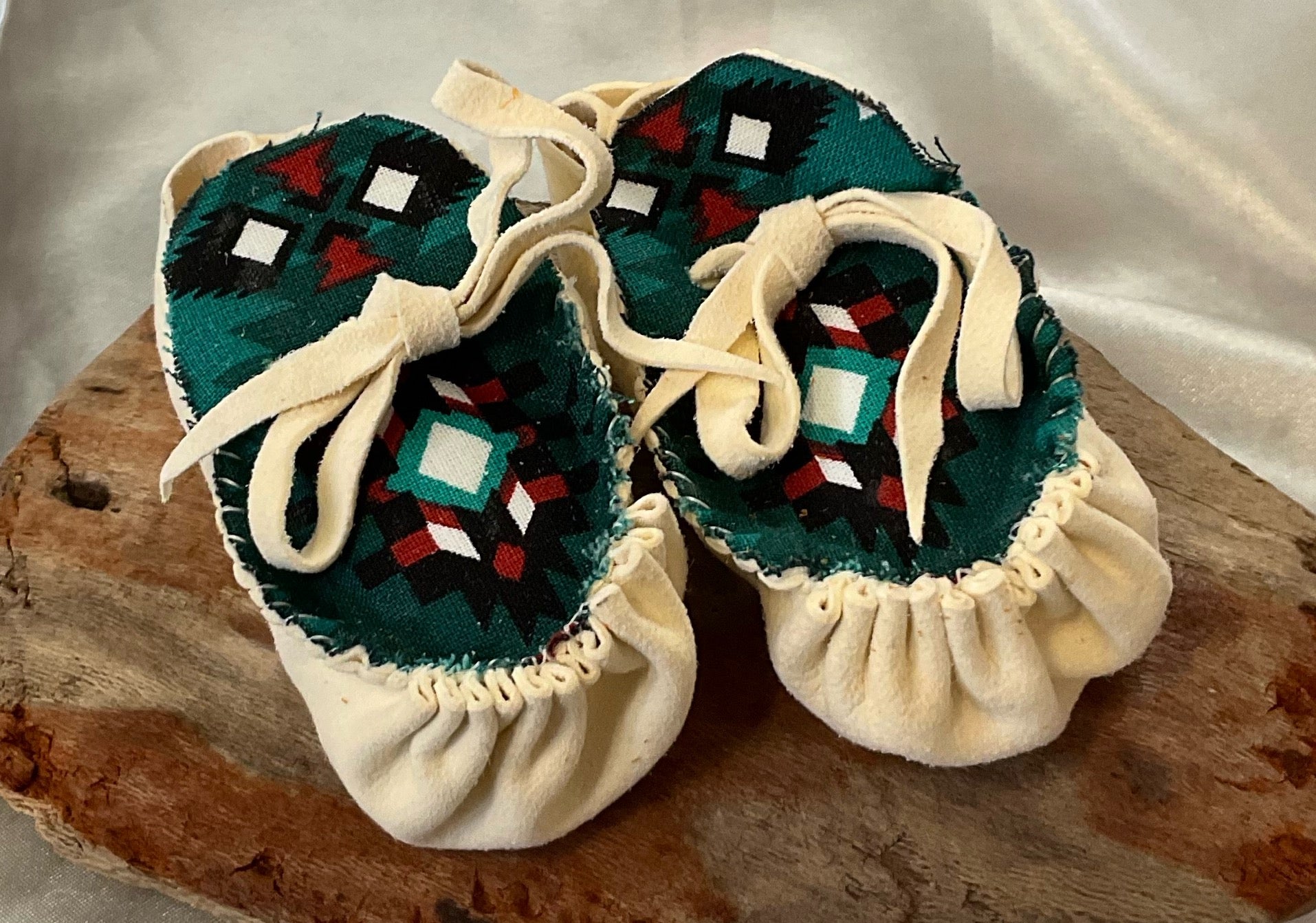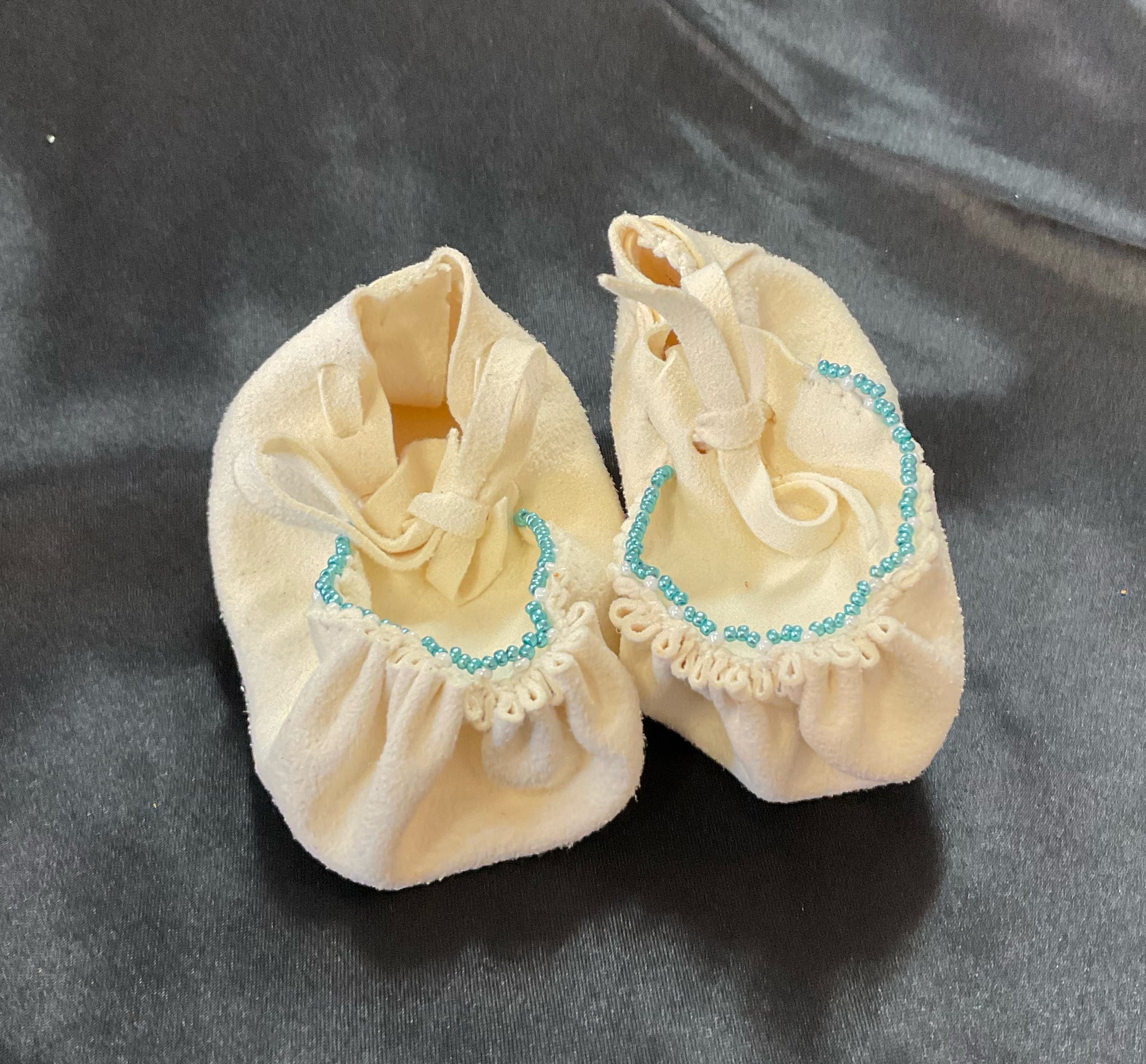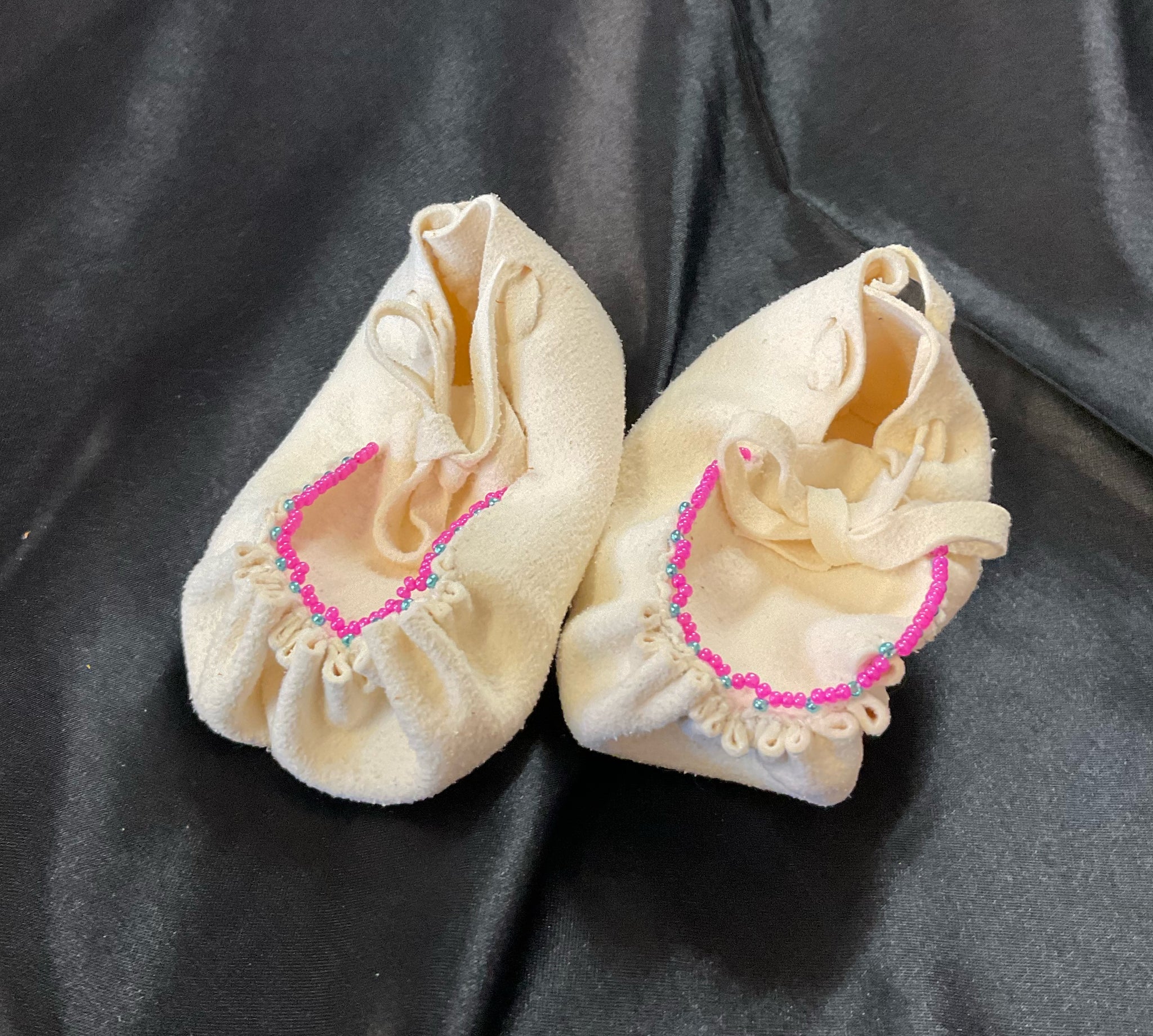 Beaded Mocs are locally made and beaded by Marcella Foreman of the Keetoowah Band of the Cherokees. Sizes average 3 1/2”-4” long.