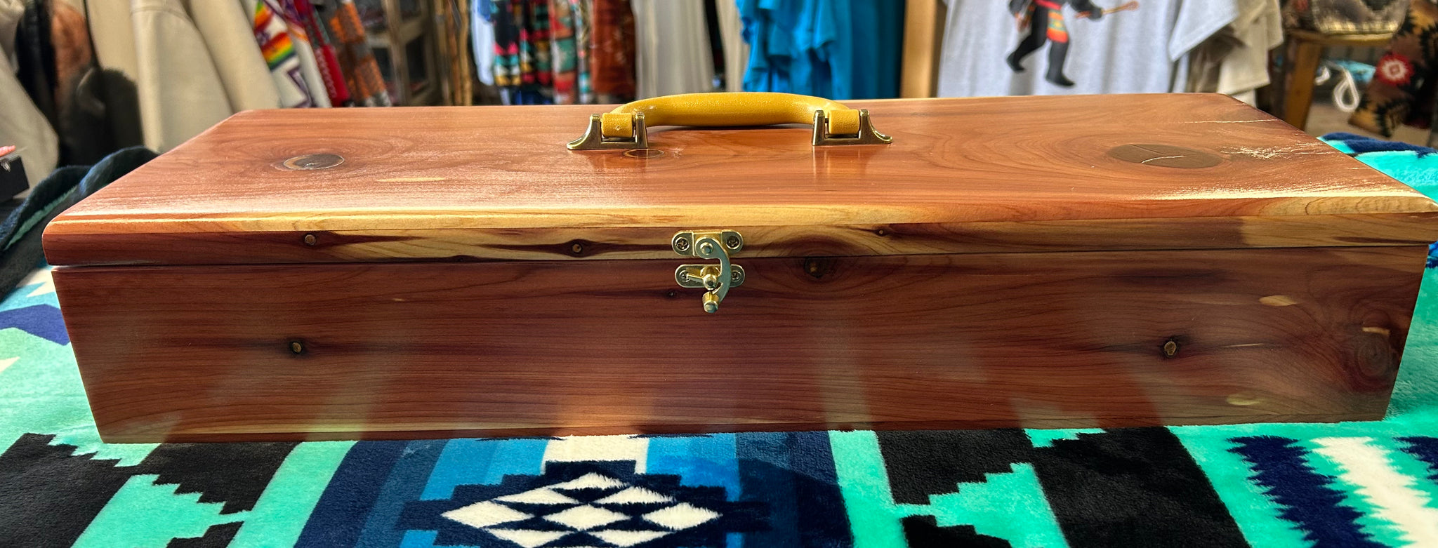 Handcrafted by Native American artisans, this authentic cedar box brings natural beauty and functionality to any space. Measuring 21.5" long, 8" wide, and 4" tall with an interior workspace of 20.25" by 6.625", it offers generous storage for treasured items, documents, or collectibles. The aromatic cedar wood naturally repels insects while adding warmth to your décor. A timeless piece that honors traditional craftsmanship and supports indigenous makers.