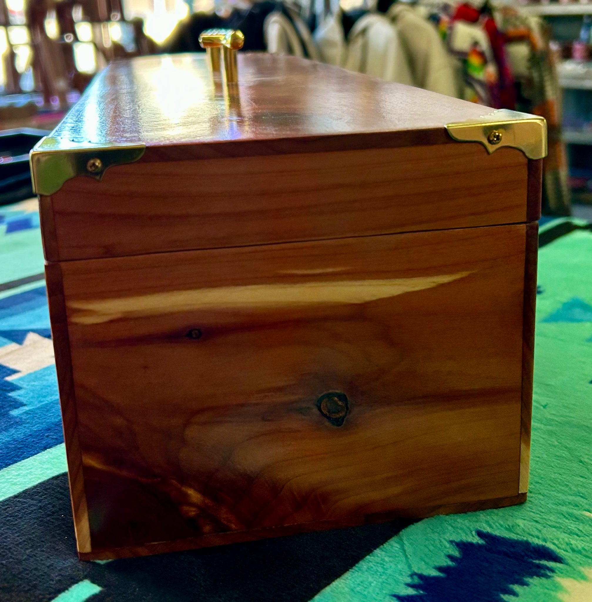 Handcrafted by Native American artisans, this authentic cedar box brings natural beauty and functionality to any space. Measuring 21.5" long, 5.875" wide, and 5" tall, it offers a generous 20.75" x 5" interior perfect for storing jewelry, keepsakes, or treasured collections. The aromatic cedar wood naturally repels insects while adding warmth to your home. A timeless piece that honors traditional craftsmanship and supports indigenous makers.