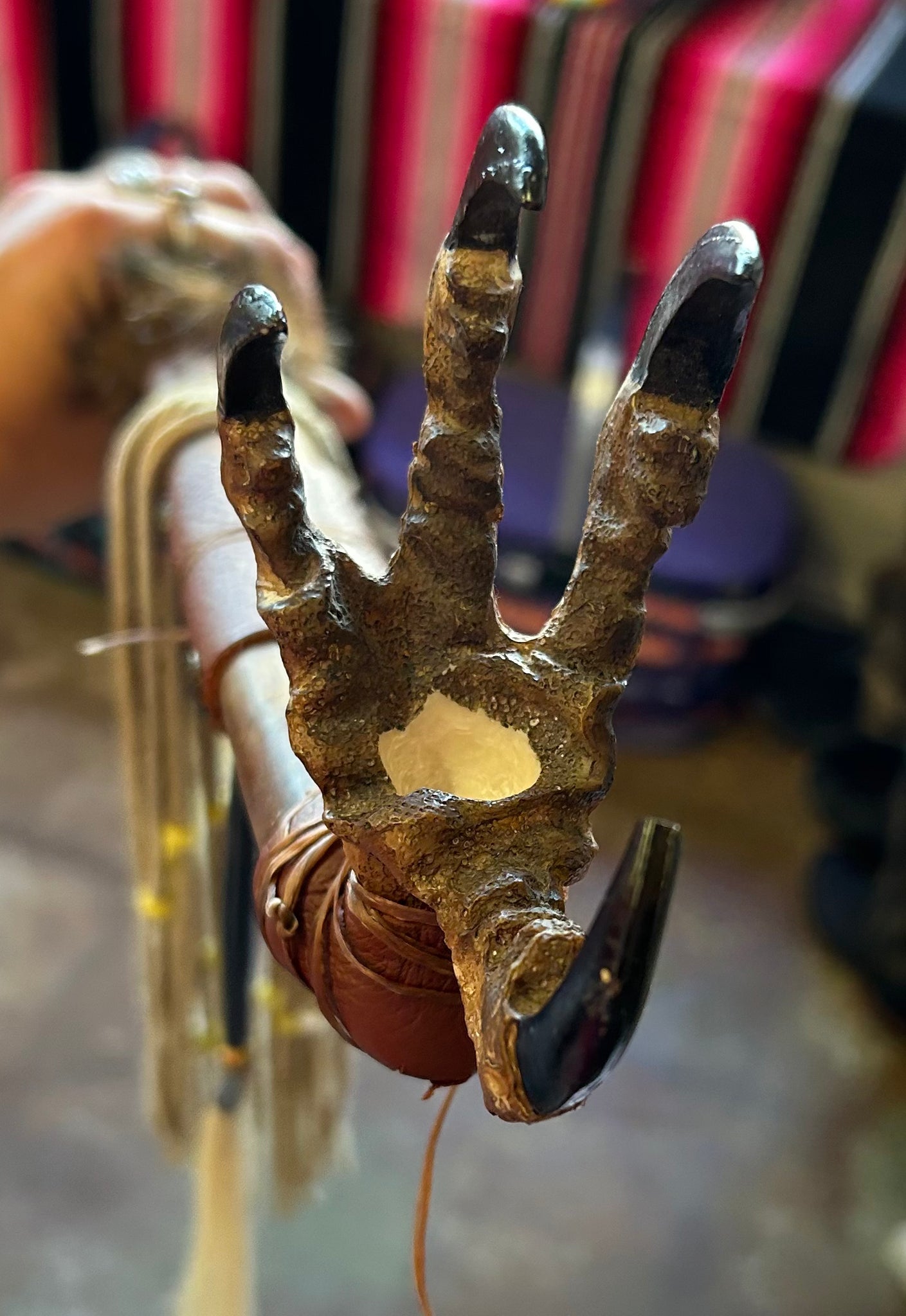 This Native American-made pipe features a striking eagle claw crafted from resin, blending traditional craftsmanship with artistic beauty. Perfect as a decorative piece, it adds a unique cultural touch to any space while showcasing exceptional detail. Elevate your collection with this meaningful and visually captivating work of art.