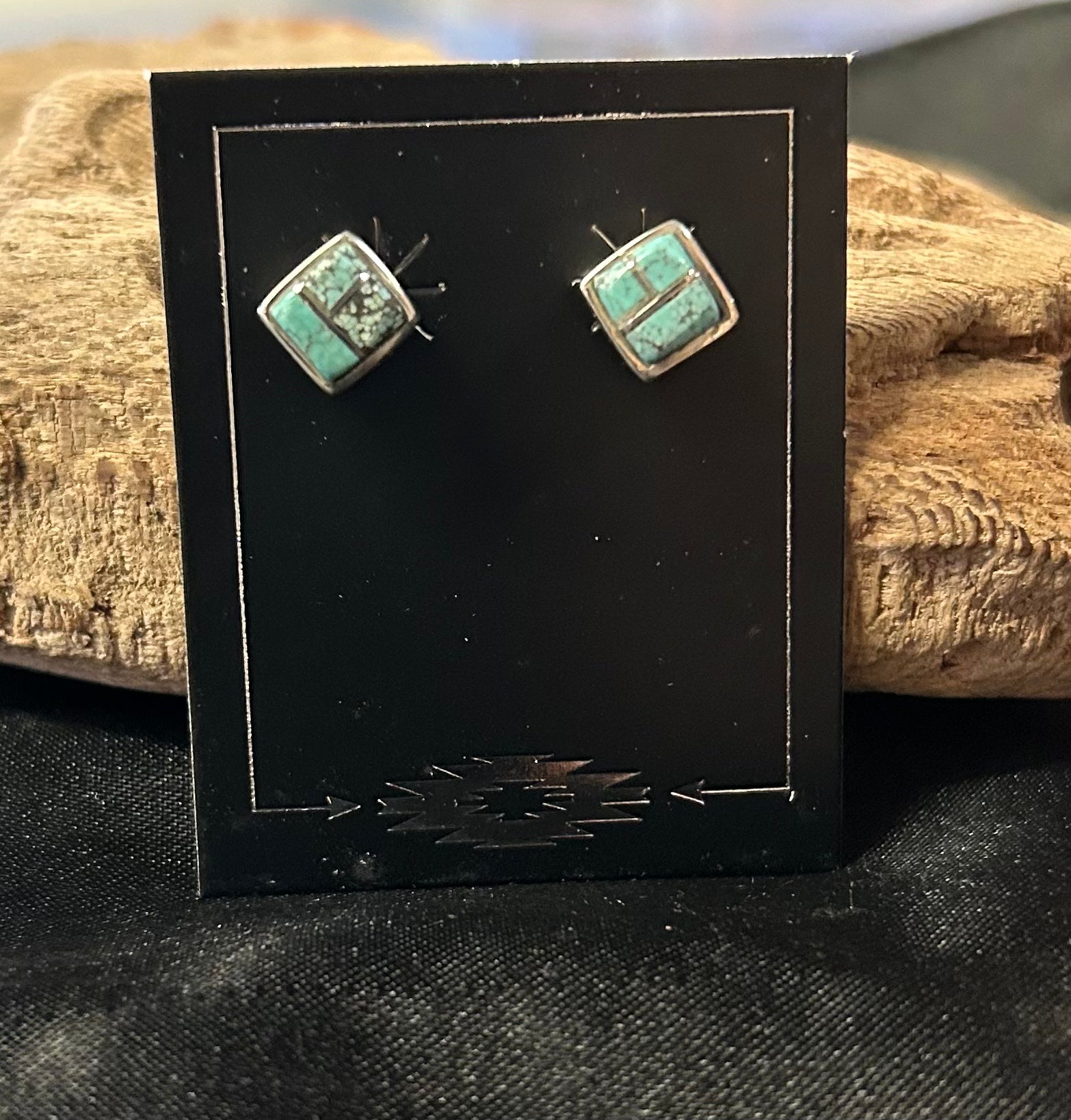 Elevate your style with our stunning #8 Turquoise Earrings. Handcrafted with native made inlay on post and hooks, these earrings add a touch of beauty to any outfit. Complete your look with these elegant earrings that showcase the unique craftsmanship of our artisans.