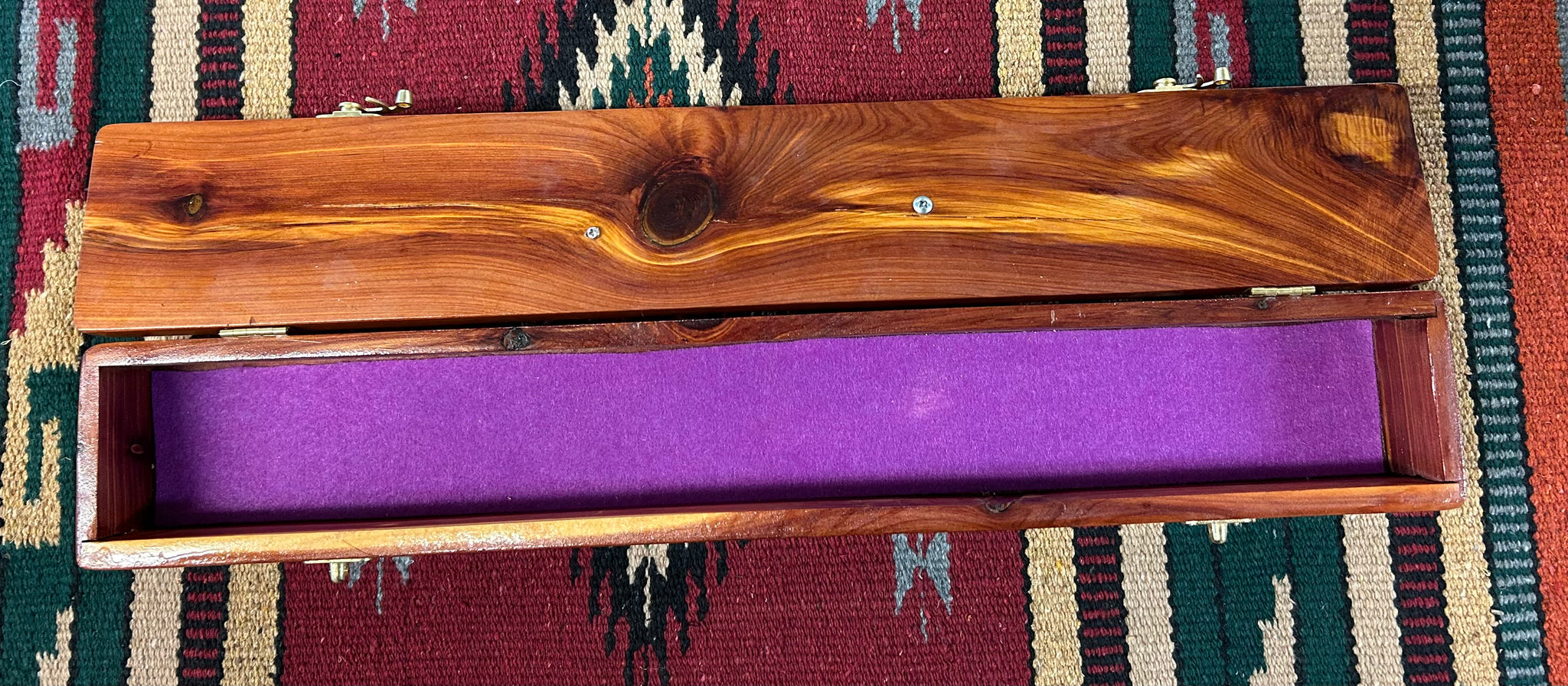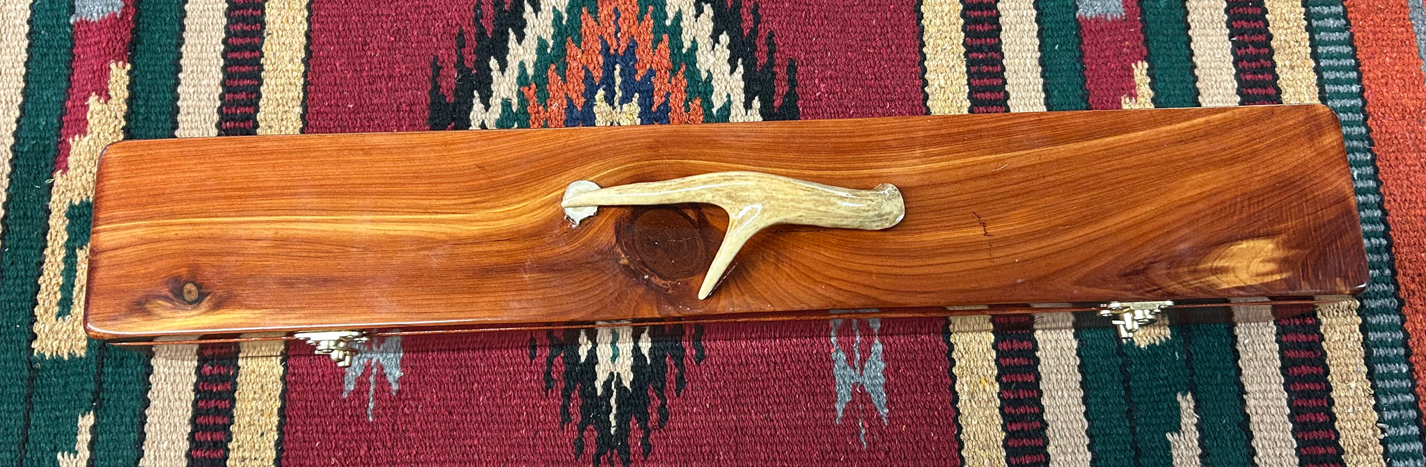 Handcrafted by Native American artisans, this authentic cedar box with an antler handle brings natural beauty and functionality to your space. Measuring 12.5" long, 3.5" wide, and 3" tall, it offers a generous 20.75" by 2.5" interior capacity—perfect for storing jewelry, keepsakes, feathers or treasured mementos.