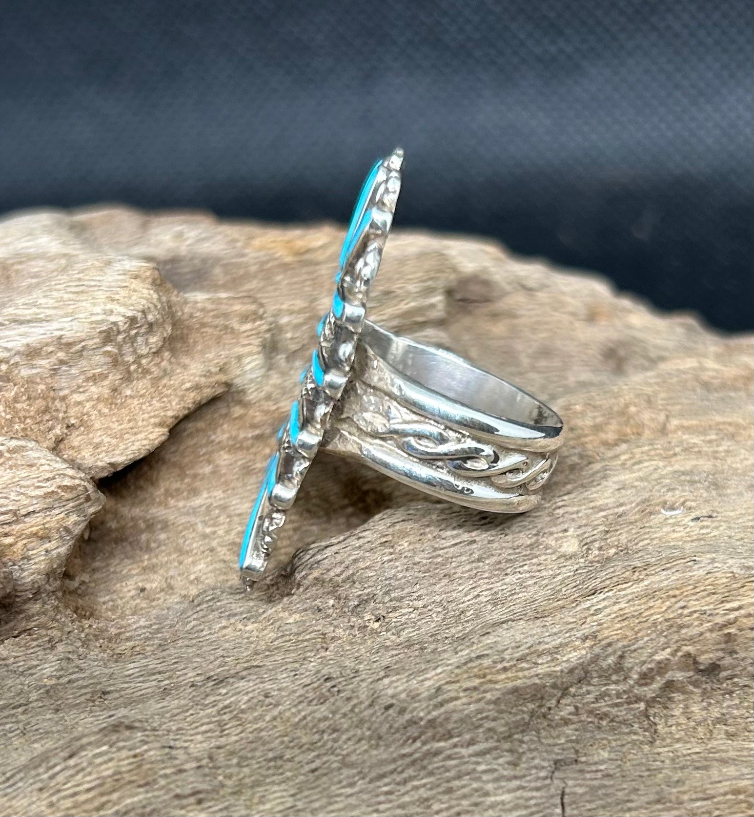 Handcrafted by Zuni artisans, this sterling silver ring features authentic Sleeping Beauty turquoise set in traditional needlepoint design. The vibrant blue-green stone is carefully inlaid with intricate silverwork, creating a striking geometric pattern characteristic of Zuni craftsmanship. Each piece celebrates Native American artistry and cultural heritage. Size 9.5. A timeless statement piece that honors generations of skilled jewelry-making tradition.